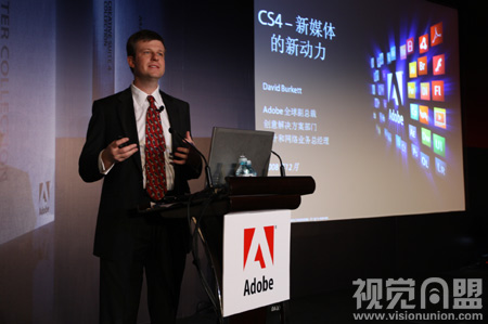 Adobe公司全球副总裁、创意解决方案部门设计和网络业务总经理David Burkett先生做了题为“新媒体、新动力”的主题演讲,他表示:人们正生活在一个信息爆炸的时代,每天都被来自平面、电视、网络、手机等多种媒体的各种信息包围着。Adobe Creative Suite 4能够激发设计师和开发人员的创意灵感,跨越不同媒体展现一致的设计构想,满足人们从各种途径获取精彩体验的需求。