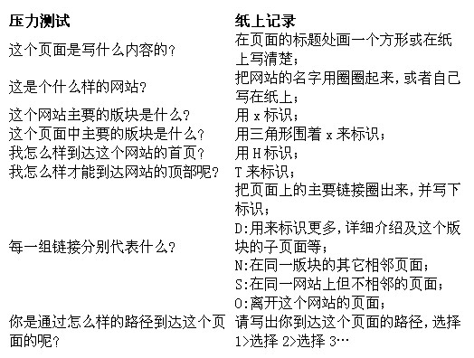 (1) 随机的从你的网站上选择一个页面; (2) 把这个页面打印成黑白的,并把页面头部的浏览器地址栏和下面的版权及公司信息部份去掉; (3) 假装你是第一次进入这个网站,并试图回答下面的问题(详见下列问题列表); (4) 在一张纸上写下你所想的和答案;