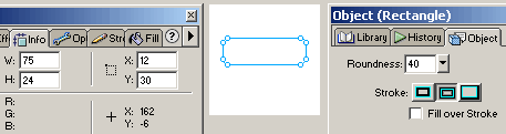 我们使用Fireworks 4制作这样的效果,Fwmx只要在工具与属性面板中找到相应参数设置就行了。 1、新建画布,大小100*100,背景为白色。 2、用圆角矩形工具画一个矩形,大小随意,在OBJECT面板中设置矩形的圆角度。