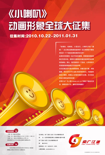 三、 征集办法 1. 报名时间:本次征集活动周期为2010年10月22日至2011年1月31日。材料有效邮寄截止日期至2010年1月31日(以邮戳为准) 2. 报名方法:应征者不需缴纳报名费或其他任何费用,只需在网站上下载电子表格。填写完整后,通过电子邮件将报名表及作品发送至以下地址,也可将参赛作品刻录成DVD数据光盘与报名表一并邮寄至以下地址。 3. 电子作品发送至小喇叭信箱:xiaolaba@cnr.cn. 4. 纸质作品或光盘邮寄地址:北京市西城区南礼士路建威大厦1908室 央广江通(北京)文化传播有限公司 小喇叭形象征集活动组收 邮编100045 5. 活动咨询电话:010-68080459-8080;QQ客服:694205937