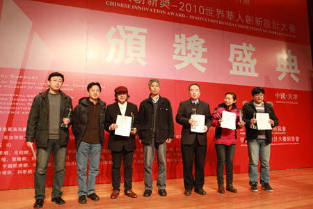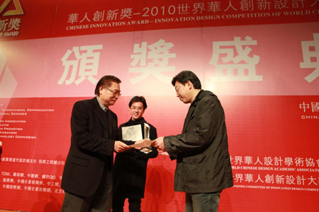 “华人创新奖-2010世界华人创新设计大赛”颁奖盛典于12月12日18时在天津理工大学新南楼C区报告厅举行,出席颁奖盛典的嘉宾与领导有:香港理工大学博士生导师林衍堂教授、天津理工大学教务处处长郑清春教授、大连民族学院设计学院院长马春东教授、清华大学设计管理研究所所长蔡军教授、华东理工大学艺术设计与传媒学院院长程建新教授、南京理工大学设计艺术与传媒学院院长李亚军教授、上海交通大学媒体与设计学院设计管理研究所所长刘国余教授、东南大学艺术学院副院长崔天剑教授、北京理工大学设计与艺术学院冯明教授、天津理工大学艺术学院副院长钟蕾教授、可乐马古典家具博物馆馆长马可乐先生。大赛共设置企业组、自由组和其他组共14项大奖。沈阳机床股份有限公司钣焊分公司选送的作品CK514数控立式铣床凭借较高的设计水准获得企业组至尊奖,上海凯仕工业设计有限公司、云南CY机床集团有限公司分别获得企业组最具商业价值奖,天津百利阳光环保设备有限公司、东北大学工业设计研究所等单位获得企业组优秀产品设计奖。刘光明教授、林衍堂教授、蔡军教授、刘国余教授分别为获奖者颁奖。沈阳航天航空大学冯霞以其出色的作品摘得“华人创新奖”自由组“金奖”桂冠。深圳大学研究生黄中文、四川绵阳职业技术学院刘琴获得“银奖”,清华大学美术学院罗建平等获得“铜奖”。此外,燕山大学、吉林动画学院、江汉大学等单位获得优秀组织单位奖,华南农业大学、淮阴工学院、大连工业大学等单位获得最佳设计团队奖,天津理工大学窦金花、大连交通大学邹雅琢、台湾嶺東科技大學李雁隆等十名教师获得优秀指导教师奖,东北大学工业设计研究所获得最佳产学研成果奖。郑清春教授、马春东教授、程建新教授、李亚军教授、冯明教授、崔天健教授、钟蕾教授分别为获奖者颁奖。