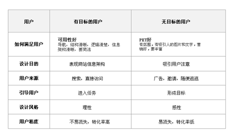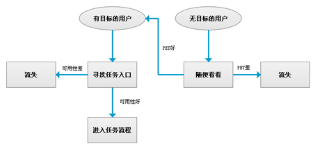 将可用性和PET分开考虑 浏览首页的用户基本分为两种:有目标的用户和无目标的用户。Alan Cooper的“目标导向”理念告诉我们,用户的目标驱动任务,有目标的用户直接开始“任务”,我们只要为他们解决可用性的问题。而那些无目标的用户,他们只是随便逛逛,需要首页的PET足够好,将此类用户“转化”成有目标的用户,尽量避免他们“流失”。