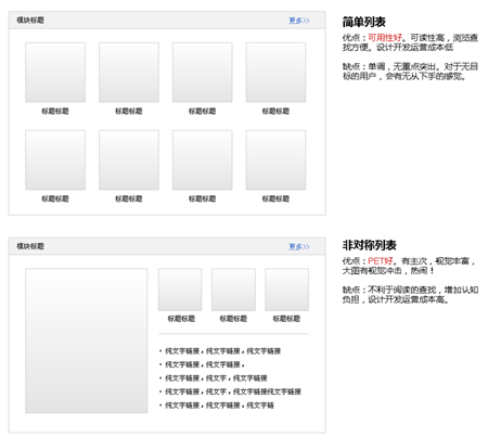 5.首页的模块中使用尽可能简单的列表,简单列表更容易被理解和读懂,且设计运营开发成本低。当然,“非对称列表”也有优势,见下图,设计师应该根据用户类型和设计目标来灵活运用。