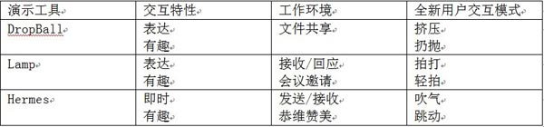 表1展示了3个演示工具在工作环境中会运用哪种全新交互模式来表达这3中交互特性