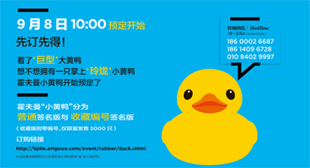 霍夫曼正版小黄鸭 预定事宜  订购链接:点击进入  正版小黄鸭衍生品将与北京国际设计周开幕同期、于9.23-9.26期间集中发货,请已经订购了正版小黄鸭的朋友们静心等待,谢谢大家对北京国际设计周和小黄鸭的支持与关注!请大家支持原创与正版,谨防盗版!关于小黄鸭预定:正版小黄鸭销售平台为2013北京国际设计周指定官方设计品电商平台“艺GO上品”(http://www.artgooo.com/)。霍夫曼小黄鸭有成年人拳头大小,为橡胶材质制成,达到儿童玩具的国家标准。在每只小黄鸭底部,均印有设计师霍夫曼的签名和北京国际设计周的logo,分为普通签名版与收藏限量签名版(限量版标有序列编号,仅限量发售5000只,售完为止)。正版小黄鸭购买咨询热线(周一至周日 10:00-17:00)186 0002 6687,186 1409 6728,010 8402 9997 (本活动最终解释权归北京国际设计周组委会(筹)办公室所有)