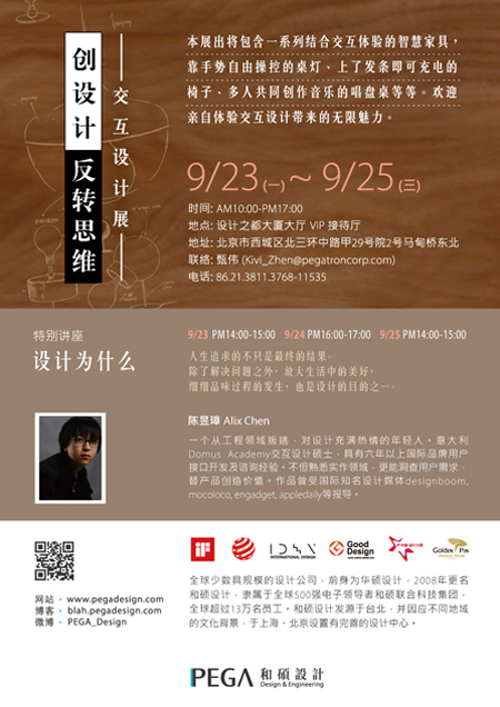 创设计——反转思维交互设计展  时间:9.23-9.25(10:00-16:00)  地点:设计之都大厦大厅VIP接待厅  类别:设计之旅  和硕设计是全球少数具规模的设计公司,前身为华硕设计,2008年更名和硕设计,隶属于全球500强电子领导者和硕联合科技集团,全球超过13万名员工,和硕设计发源于台北,并因应不同地域的文化背景,于上海设置有完善的设计中心。设计周期间,和硕设计主办的交互设计展将展出一系列结合交互体验的智慧家具,如通过手势自由操控的桌灯、上了发条即可充电的椅子、多人共同创作音乐的唱盘桌等等。此外,活动期间将举行“设计为什么”的特别讲座。讲座嘉宾陈昱璋在意大利Domus Academy获得交互设计硕士,具有六年以上国际品牌用户接口开发及咨询经验。其作品曾受国际知名设计媒体designboom, mocoloco, engadget, appledaily等报导。