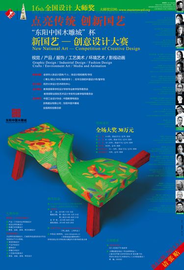 大赛类别:视觉设计;产品开发设计;居家用品设计;服饰设计;工艺美术设计;环境艺术设计;影视、动画、游戏、网页设计 参赛对象:全球华人各设计团体、个人;各设计院校教师和学生(博士、硕士、本科、高职高专);在华注册的外国设计师和留学生 主办单位:教育部高等学校设计学类专业教学指导委员会;教育部职业院校艺术设计学类专业教学指导委员会 承办单位:同济大学设计艺术研究中心;中国设计教育网 支持单位:中国工业设计协会;中国教育电视台;全国高校创意总部;浙商建业有限公司;东阳中国木雕城