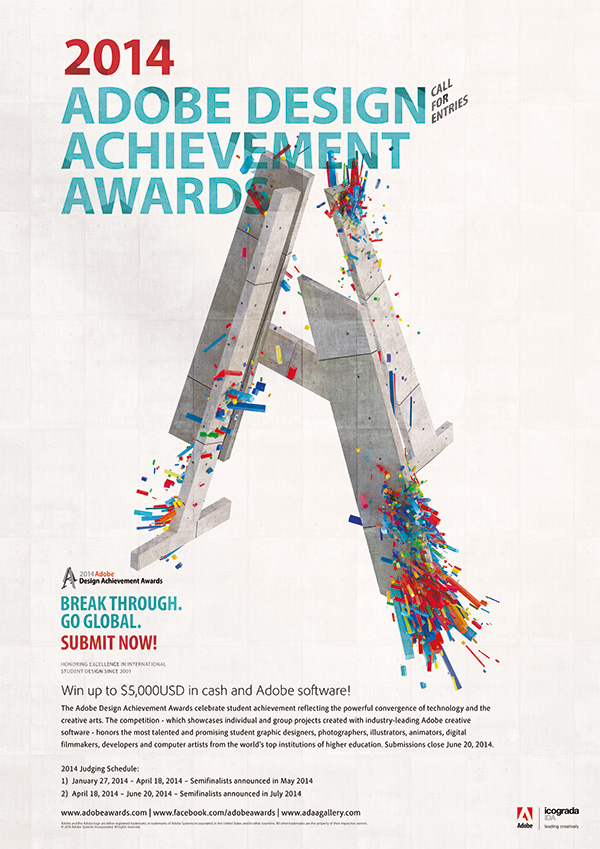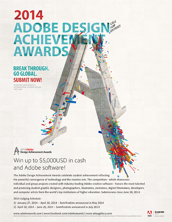 旨在奖励学生和教师在统合技术与艺术创作上的杰出成就。本项竞赛所展现的是使用领先业界的Adobe创意软件制作的个人和团体项目,表彰全球顶尖高等教育机构中,在美工设计、摄影、插画、动画、数字制片、应用程序开发与计算机艺术等领域的杰出师生。