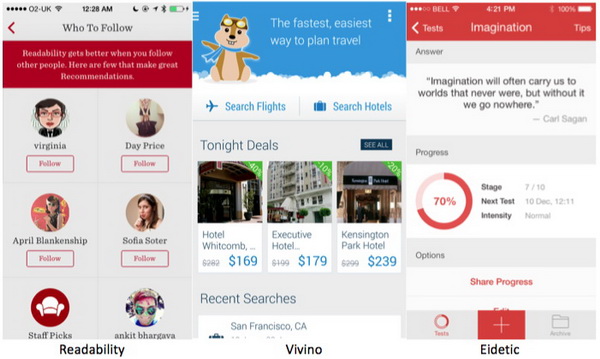 Readability采用红色主色调设计,连提示信息背景色、线性按钮和图标都采用红色主色调,界面和LOGO也完全是一个色系的。而Vivino采用蓝色主色调设计,信息用深蓝、浅蓝加以区隔。Eidetic采用橙色主色调设计,其中的关键操作按钮甚至整个用橙色提亮,信息图标也用深橙色、浅橙色来表达程度。