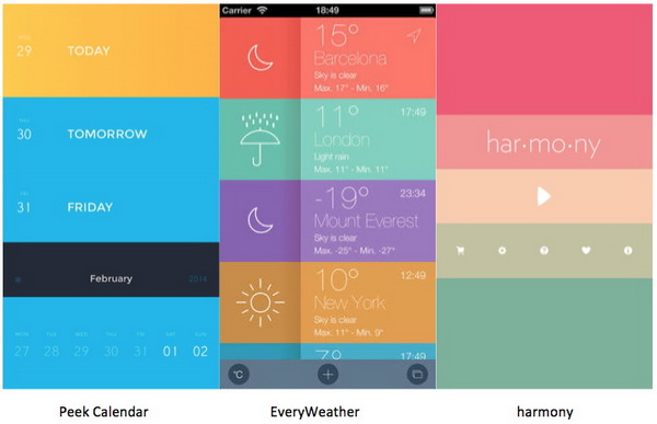 而Peek Calendar、EveryWeather和Harmony这三个APP,是列表多彩色的设计案例,这种列表多彩色,不知道是不是从Clear开始再度流行起立的,用鲜亮的多彩色来区分信息,确实能起到突出的效果,视觉上极其醒目。