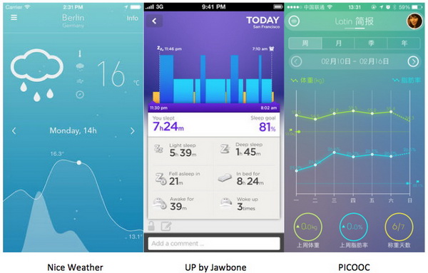 Nice Weather用曲线图来表达温度的变化,Jawbone UP用柱状图来表达每天的完成情况,PICOOC用折线图来表达每天体重、体脂的变化。移动APP利用数据可视化,可以在更小的屏幕空间内,更立体化的展示内容。