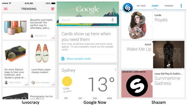 luvocracy的卡片流突出信息本身,用大图和标题文字吸引用户,强化了无尽浏览的体验,吸引用户一直滚动下去。Google Now的卡片则更加的定制化、个性化。有的卡片是用来做用户教育的,有的卡片是用来告知天气的,有的卡片是呈现联系人列表的,有点卡片是显示待办事项的。不同的卡片都遵循在一个统一宽度和样式的卡片内,进行发挥和设计。既保证了卡片和卡片之间的独立性,又保证了服务和服务的统一化设计。Shazam则用一种趣味的卡片样式,呈现专辑和歌曲。