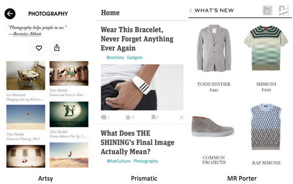 Artsy的图片瀑布流,完全没有用到线和面来区分信息组块,而就是用内容本身做排版,用户可以更加集中注意力于图片内容上。Prismatic利用字体排版,尽可能的内容前置,弱化图标和操作,让用户更集中注意力于内容阅读上。而MR Porter则利用商品图片、名称和价格直接做设计,让用户聚焦于商品本身。