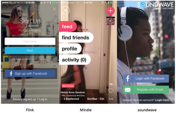 大视野背景图风格也分为两种,一种像Secret、The Whole Pantry这样的,内容区块中采用大视野背景图,好处是可以利用图片做区块分割,难度是图片拼接后的效果不一定好看,所以可能还需要配合描边、留白等设计手段优化拼接。另外一种就是想Vsco、Flink、Mindie、Soundwave这样的,全屏背景图甚至打通状态栏,前景做内容排版、导航、操作。好处是设计非常具有生命了,所有有朋友把这种风格也叫有计划设计,说的就是回归大自然的设计手法。但风险也是很明显的,就是前景的信息排布设计其实是有很大挑战的,必经花花绿绿的背景太过于干扰注意力,导致前景的文字内容可读性会变弱。所以需要把重要操作用明确的按钮区隔出来,阅读型文字跟背景图要用明显的反色,还是不行的话就把文字浮在半透明蒙层上,解决可读性问题。