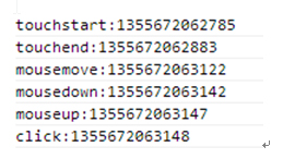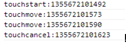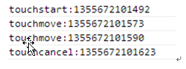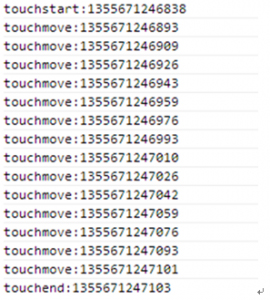 $(‘#screen’).on(‘touchstart touchmove touchend touchcancel’,function(e){ e.preventDefault(); console.log(e.originalEvent.type+’:’+e.originalEvent.timeStamp); });