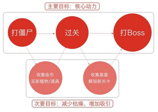 单线程目标 植物大战僵尸也是大家非常熟悉的游戏,它也有一个很明确的主要目标,打僵尸—过关—打boss通关,但它在中间还引入了其他一些次级目标。比如你要过关,就要收集金币,买更多的植物和道具,这样才能增强战斗力,应对不同类型的僵尸。在植物大战僵尸2中,不同的关卡是有星级的,要收集到足够的星星,才能解锁新的模式,更出色的完成任务,收集星星,也成了一个次级目标。
