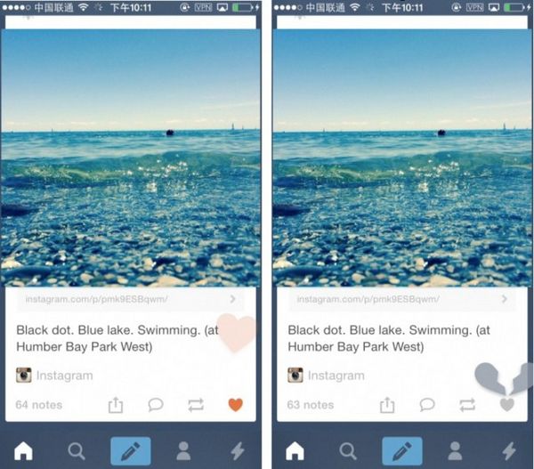 用动效表现材质 用动效表现材质,不会增加用户的视觉负担,在操控上更有真实感,所以就算拟物化的视觉设计已经慢慢在衰退,具有真实意义的动效却得以保留。 细节处的小动效可以为产品增加亮点,带来惊喜的体验。就像Tumblr点赞的动画,红心飘起来时,就像飞了一个吻,让人感觉心花怒放,取消点赞时,心都碎了。这种小细节让人爱不释手。