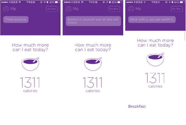 积极的反馈 NoomWeigth是一款帮助用户节食瘦身的app,它在界面下拉的地方巧妙的设置了一个小彩蛋。用户每次下拉界面,都会看到一句鼓励你继续坚持减肥的话,“继续坚持下去,这一切都是值得的”“相信你自己!”“保持积极”,这些鼓励的话语可以调动起用户坚持下去的积极性,在节食瘦身期间保持动力。