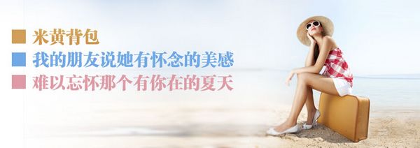当然,我们还可以用其它选好的颜色做出主次分明,区块划分。主题用包的米黄色,中间选用了海天的蓝色,而最后用了粉色。注意,到了这里,请再看一遍图。发现了吗?”米黄背包”的背景是蓝色,这四个字非常突出。而下面两行,与背景相似的色彩,蓝字对海天,粉字对沙滩,很和谐。
