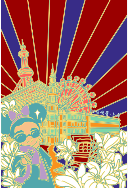 创作理念:作品以亮黄色、蓝色为主色调,与雅辰悦居酒店品牌logo颜色相近,并利用上海中心、东方明珠、小笼包等元素以体现城市特色。如今上海已形成“五个中心”,形成了龙头效应,故在画面中心,运用了龙头的形象。同时也加入了平日生活中晾晒衣物的场景,以体现上海生活。画面以撞色为主也希望激发观者的新奇感、兴奋感和愉悦感。