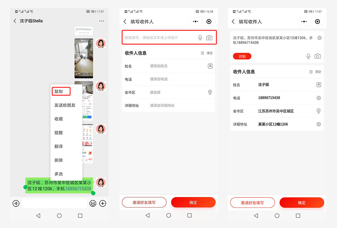 其他APP,需要在两个应用中不断的切换,复制粘贴对应的姓名、手机号码、地址等字段信息。