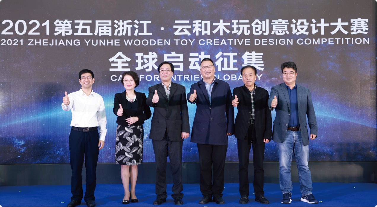 陈鹰、吕璞琪、黄伟杰、叶时扬、卢纯福、廖复新共同启动2021第五届浙江云和木玩创意设计大赛。