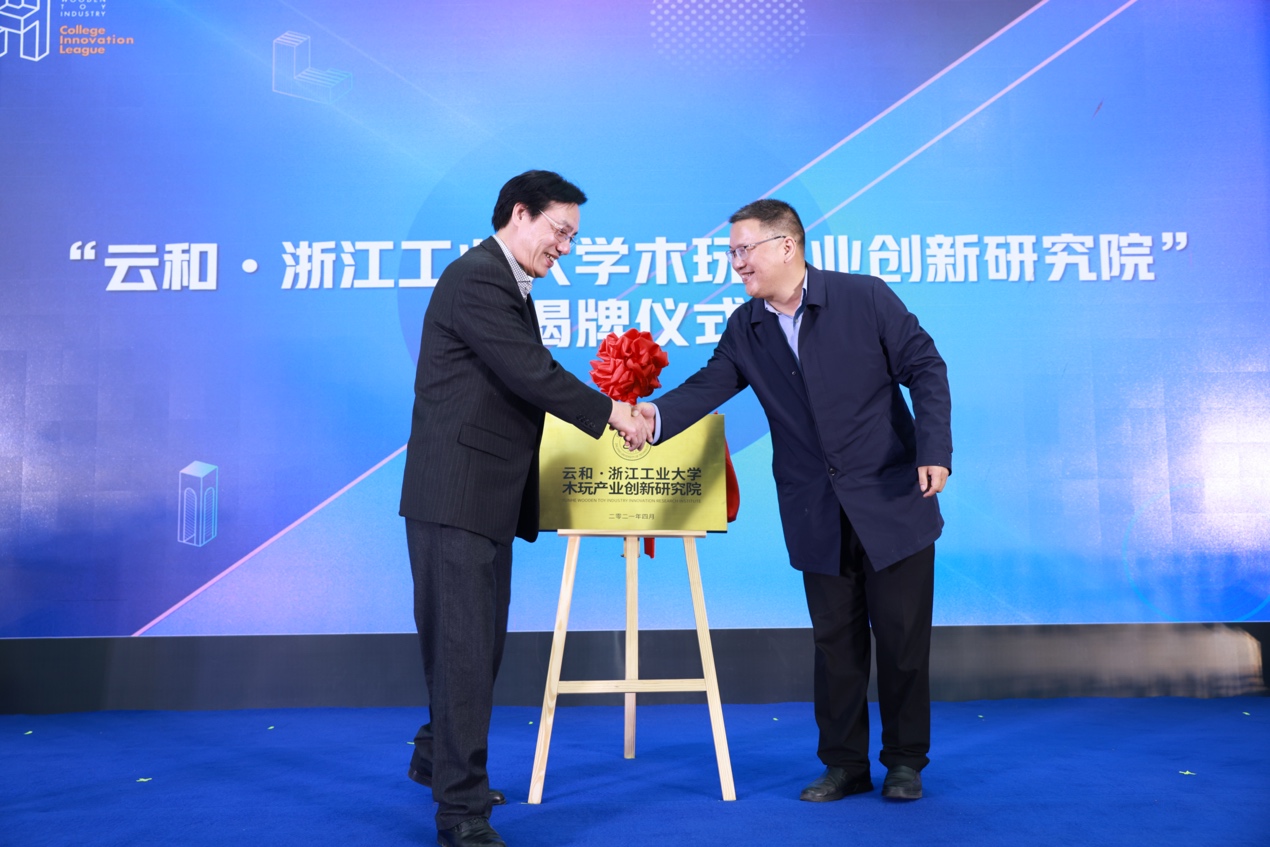 仪式上,陈鹰副校长与叶时扬副县长共同为“云和浙江工业大学木玩产业创新研究院”揭牌。
