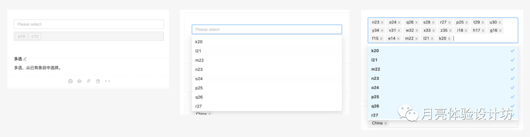 如果一定要使用下拉菜单完成多选任务的话,那设计师必须要带上一个已选搜集器,这样用户就可以在选择同时知道自己已选了哪些。其实这种交互设计已经不是组件范畴了,而是一种解决多选任务的交互模式。所以说小编真的不太推荐用下拉列表去完成多选任务。