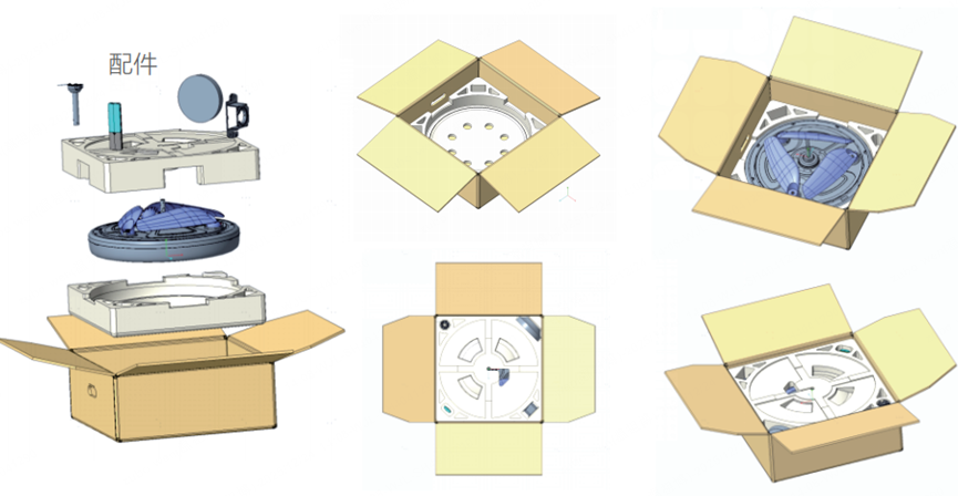 轻量化设计,针对小型卧室风扇灯,通过结构力学优化,设计一款减重30%的环保包装,取消传统的泡沫缓冲件,通过对环保材料的结构实现防摔,防踩,防刮花等保护。
