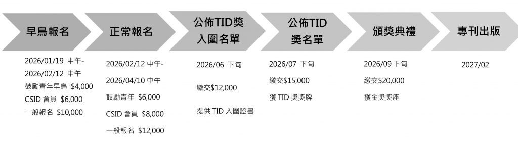早鸟报名优惠期间:2026年01月19日 (一) 中午12:00起 ~ 2026年02月12日 (四) 中午12:00截止。 一般线上报名期间:2026年02月12日 (四) 中午12:00起 ~ 2026年04月10日 (五) 中午12:00截止报名。 TID奖入围名单:2026年06月下旬公布在TID官网及官方粉丝专页,请各位参赛者自行确认。 TID奖名单:2026年07月下旬公布在TID官网及官方粉丝专页,请各位参赛者自行确认。 颁奖典礼预计于2026年09月下旬举行。 得奖作品专刊预计于2027年02月出版。 (以上时间如有异动,将于TID官网及官方粉丝专页公布) ※ 主办单位不会对未入选复审之作品做出解释,请勿来讯(电)确认 ※
