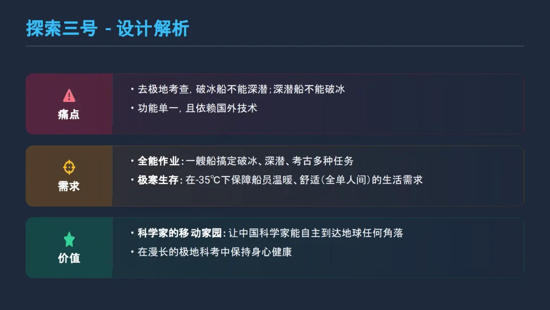 “探索三号”基于极地科考场景化洞察,以“极地+深潜+考古”的功能融合,重构了科考船的设计范式。科考船以90%的自主化率打破技术垄断,全单人间布局将人文关怀嵌入极寒作业环境,以低噪与减排设计实现科研与生态的共生。它不仅是一艘船,更是“科学家的移动家园”——以精益防寒、智能系统拓宽人类探索边界,以开放共享的平台属性推动全球科考普惠,在技术自主与人文温度的平衡中,标志着中国从“科考参与者”到“规则共建者”的时代跃迁。