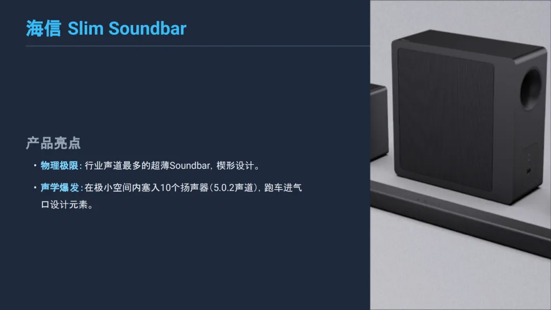 海信Slim Soundbar的楔形机身设计,在有限空间内集成10个扬声器,既解决了“音质与体积”的行业矛盾,又通过超薄形态融入家居美学。设计在此作为“场景融合的媒介”,打破了消费电子“功能至上”的思维定式,其“形态适配+功能集成+美学共生”的设计逻辑,为消费电子行业提供了“技术退居幕后,体验成为核心”的创新路径,推动数字产品从“工具属性”向“生活美学一部分”转型。