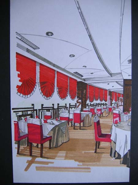 红色不够亮,易给人艳俗的感觉.如果走廊是椭圆型的,稍微再表现出一些弧度会更好. |