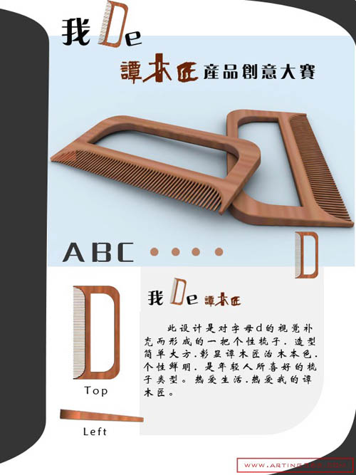 设计说明:此梳子设计来源与对大写字母D的视觉补充而造型,造型简单大方,彰显谭木匠治木本色,个性鲜明,是年轻人喜欢的类型。热爱生活,热爱我的谭木匠!