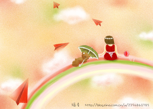 梦中的纸飞机带我回到童年的彩虹桥,玩具熊在这里,小花伞在这里,洁白的云朵从我身边飘过。。。。。。我觉得很快乐。
