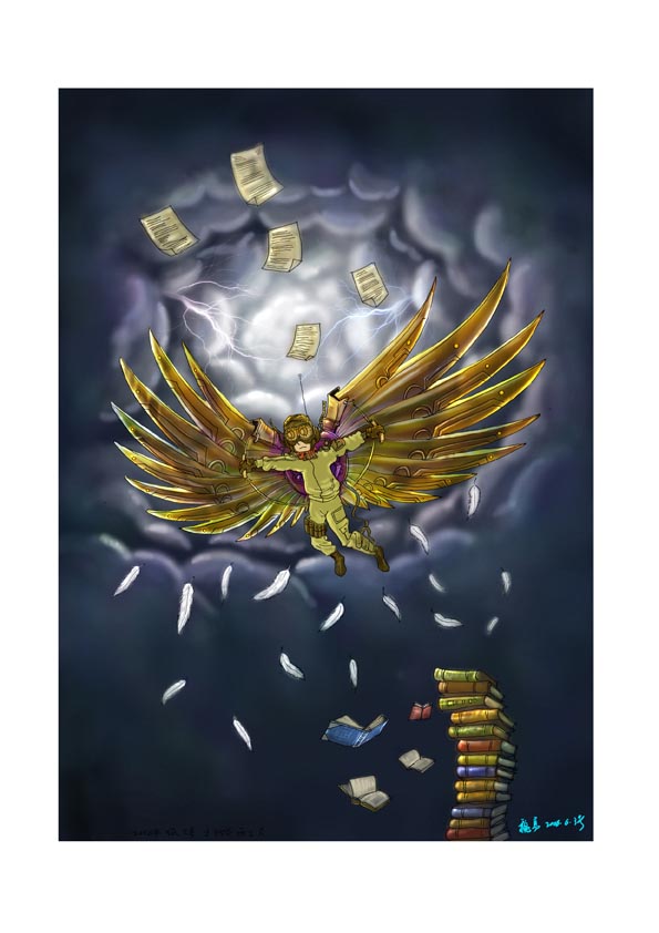 起初的印象 我只知道天使会在黎明的时刻出现 于是我努力学习关于飞行的技能 我渴望可以像鸟儿一样 可以随意的呼吸、飞行 最重要的是 可以去更自由的追逐天使的方向 起步是那样的艰难 无情的假翼 瘦小的身躯 还有渺茫的方向 一切的一切 都在模糊的开始着、进行着