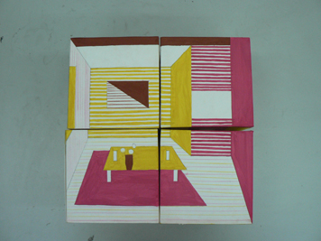 共做了四个盒子,就像用一种新的形势把平面和空间进行组合,盒子与盒子间相互分割,同时也通过不同的摆放方式,组成不同的空间效果