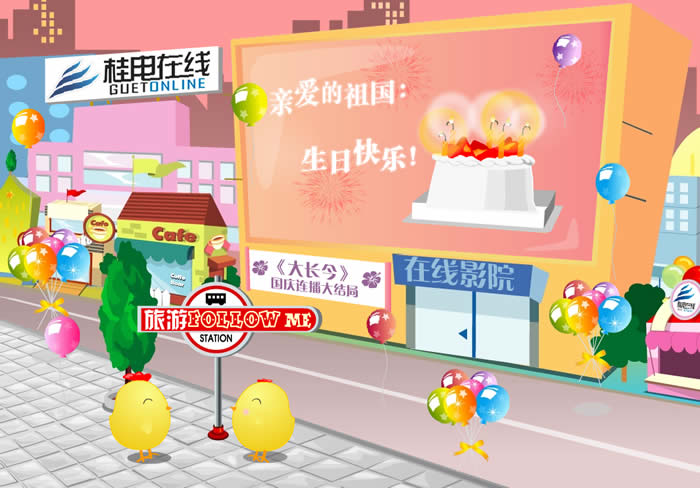 这个Flash是一个『桂电在线』的宣传广告,采用两只小鸡进行引导。小鸡的线条虽然简单,可是非常的惹人喜欢。上图为该Flash的截图。