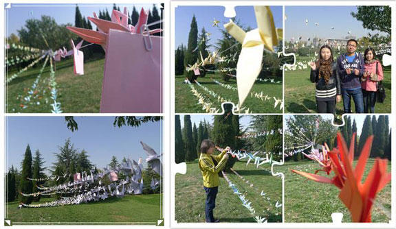 此次课题的作品为互动性校园装置,在装置上,同学们、老师,可以将自己的心愿挂在纸鹤上,以此达到心灵上的放飞。 两千多只千纸鹤,在制作的过程中,同学们将其纸鹤固定在鱼线上面,纸鹤以大小和颜色渐变,以鸟笼为支点,以放射式的形式发散到不同的树枝上面,从而达到视觉的冲击。整个装置来看,鸟笼表现了学校,是培育学生的地方,飞出去的纸鹤,表现了同学们走出校园,从青涩到成熟的慢慢蜕变。在作品的旁边,老师为同